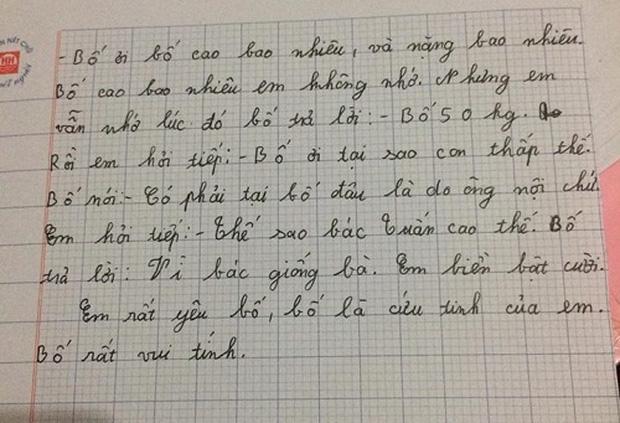 Có bài nào khó em lại hỏi bố. Bố luôn ân cần giúp đỡ em. Bố giải rất dễ hiểu. Có lần em đã hỏi bố: 'Bố ơi, bố cao bao nhiêu và nặng bao nhiêu?'.
