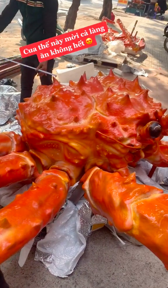 Tuy nhiên khi tiến lại gần, dễ dàng nhận ra đây là một con cua… mô hình chứ không phải "hàng real". Nhiều người phỏng đoán rất có thể quán hải sản nào đó đã đầu tư tiền làm nguyên con cua với kích thước "khủng" thế này nhằm trang trí và gây chú ý cho khách.