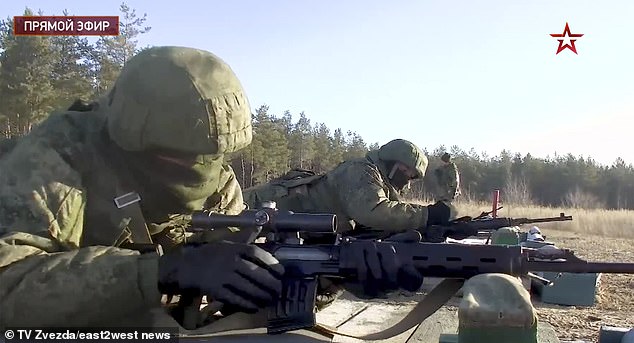 Truyền thông nhà nước Nga công bố đoạn phim về cuộc tập trận quân sự, bao gồm cả huấn luyện bắn tỉa, diễn ra ở biên giới Ukraine. Ảnh: Mail