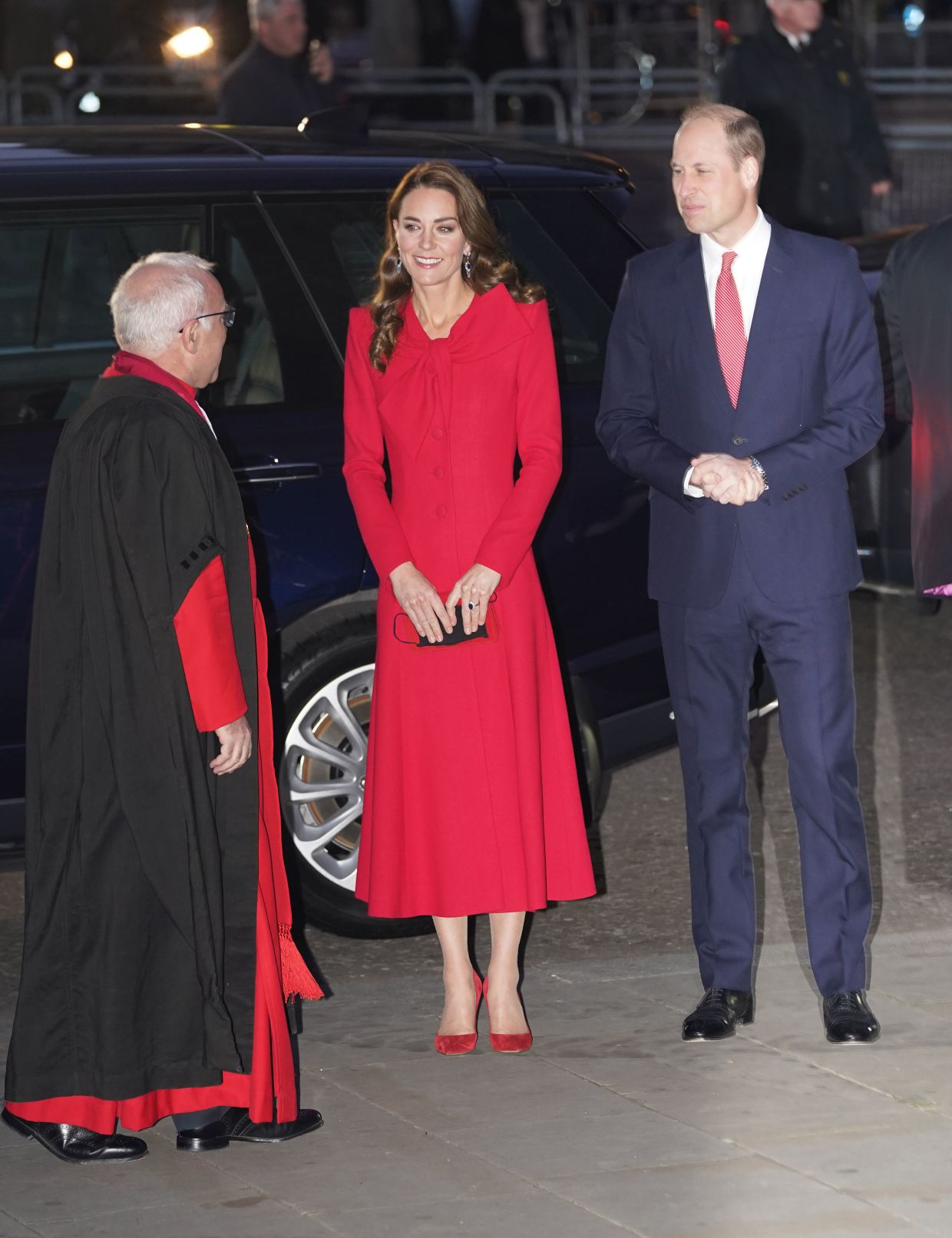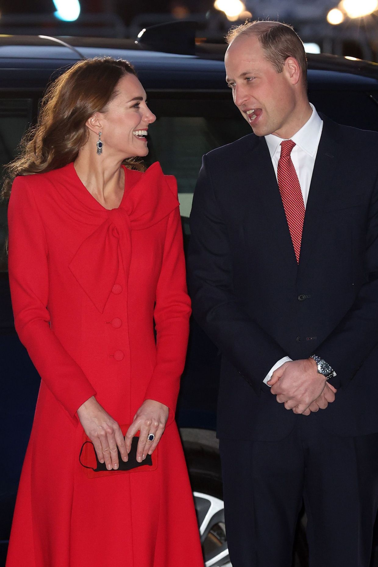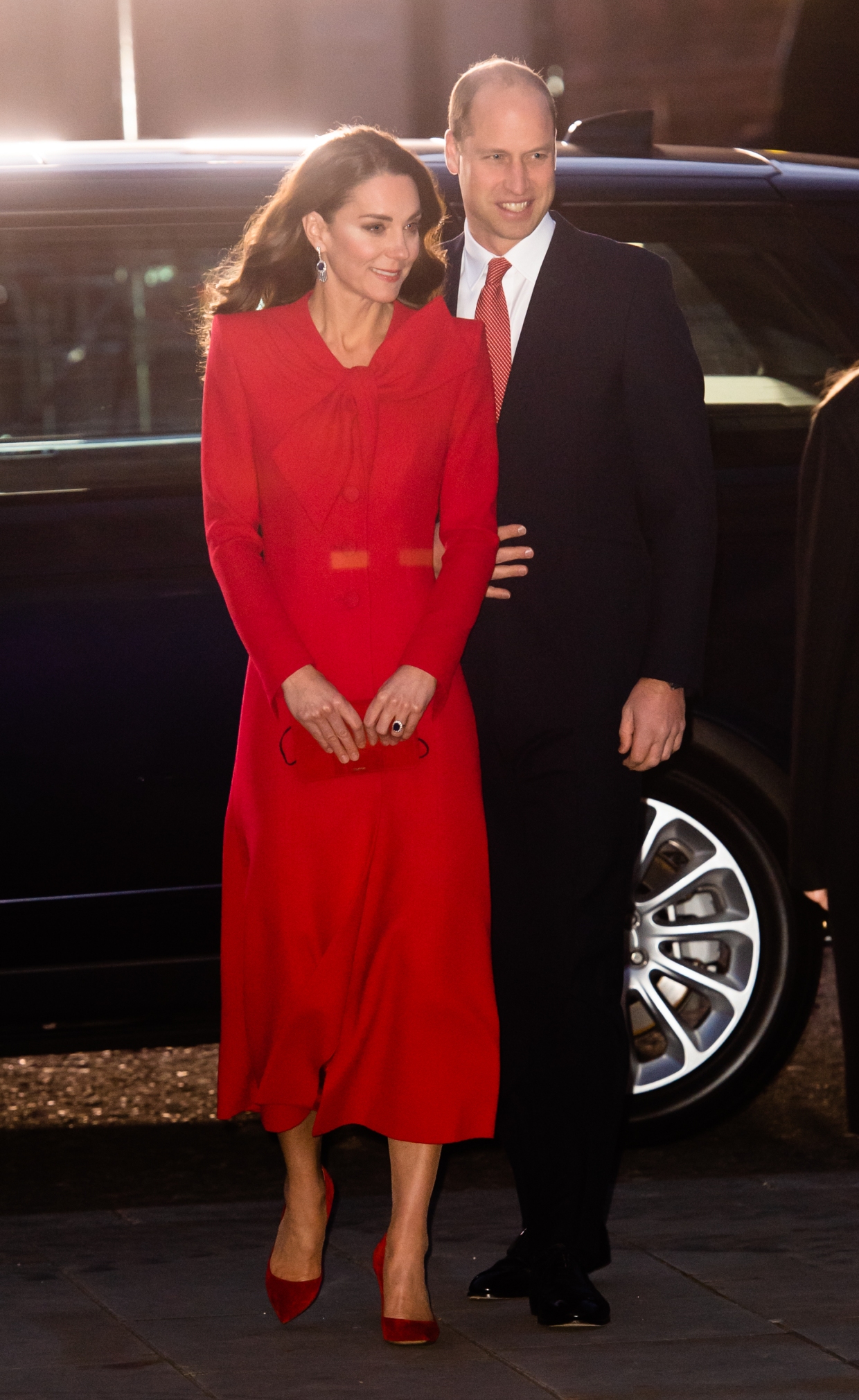 Công tước và Công nương xứ Cambridge có mặt sớm và được chào đón nhiệt liệt bởi nhiều khách mời, trong đó có cả các em học sinh và phụ huynh. Đặc biệt, Công nương Kate gây ấn tượng mạnh khi xuất hiện vô cùng rạng rỡ, xinh đẹp trong bộ váy đỏ rực nổi bật, đi kèm đôi giày cao gót cùng màu. Tóc Công nương để xoã dài, vén nhẹ tinh tế lên sẽ để lộ đôi hoa tai quý giá được bà nội chồng là Nữ hoàng Anh cho phép sử dụng cho dịp quan trọng này.