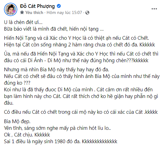 Cát Phượng chia sẻ: "U là chèn đét ơi… Bữa thì viết là mình đã mất, hiến nội tạng. Hiến nội tạng và cả xác cho y học là có thiệt ạ nếu Cát có mất.