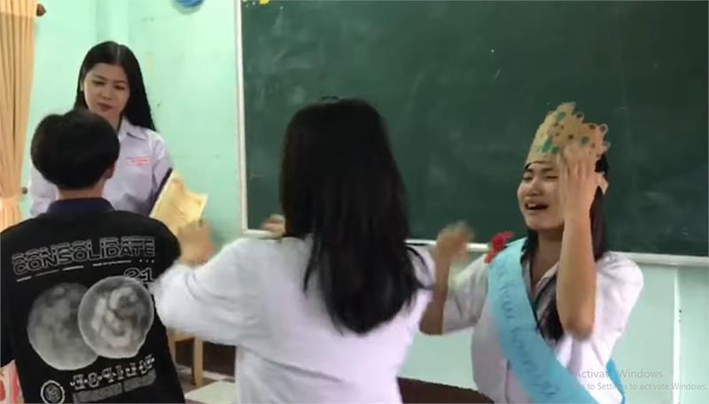 Để chứng minh sự 'tâm huyết' của mình, một lớp học đã diễn lại y nguyên hình ảnh của Thùy Tiên trước lúc trao giải.