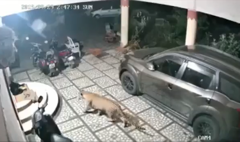 Theo như trong đoạn camera được ghi lại. Một con chó đen đang nằm ngủ ở bậc thềm trước nhà thì bất ngờ một con báo đốm từ đâu mò tới. Ngay sau đó, nó nhẹ nhàng di chuyển về phía con mồi. Khi khoảng cách đủ gần, con thú dữ lập tức lao vào cắn cổ đối phương. Tuy nhiên, con chó đã vùng đứng dậy và chạy thoát được.