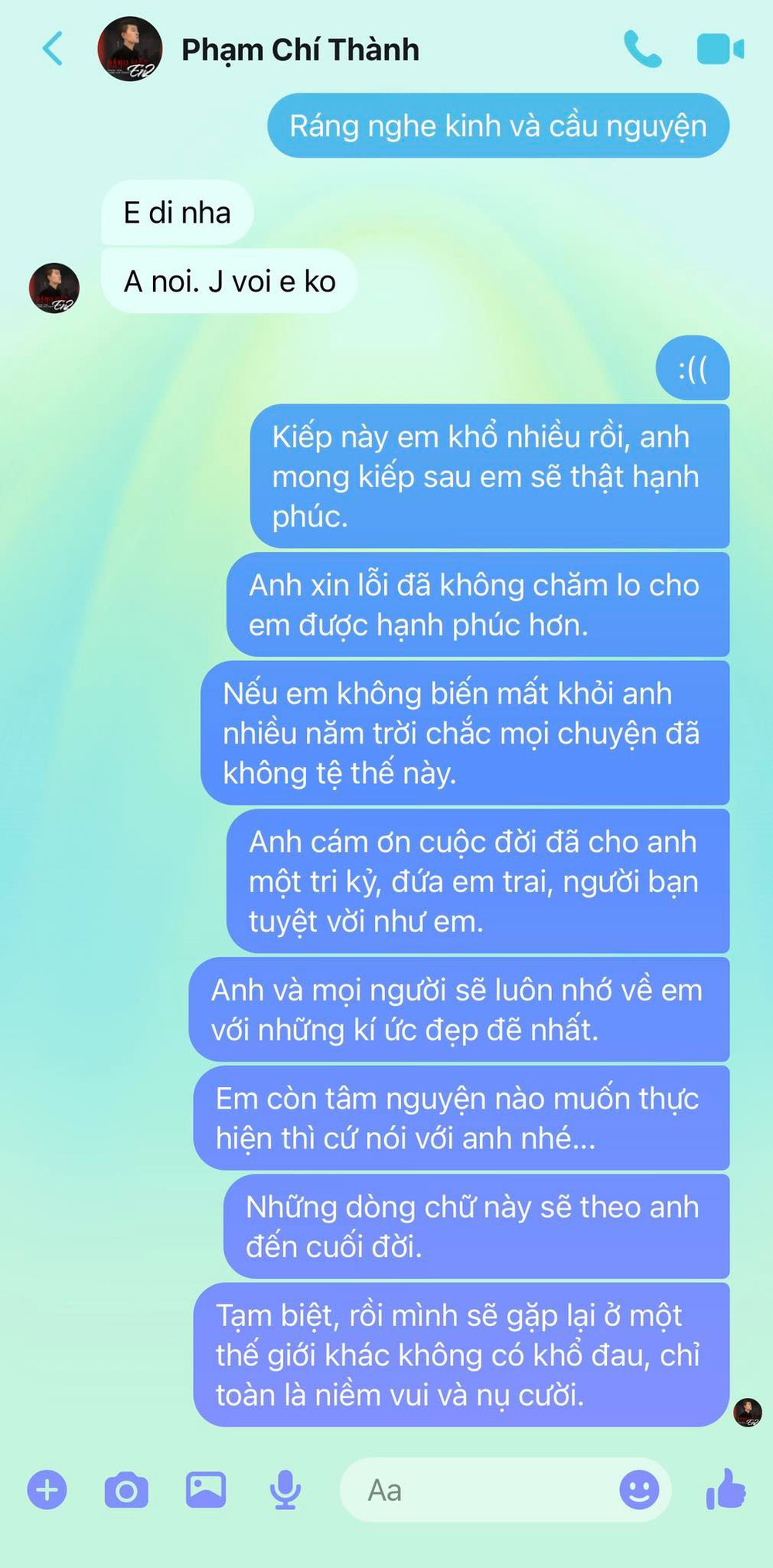 Anh cám ơn cuộc đời đã cho anh một tri kỷ, đứa em trai, người bạn tuyệt vời như em. Anh và mọi người sẽ luôn nhớ về em với những ký ức đẹp đẽ nhất. Em còn tâm nguyện nào muốn thực hiện thì cứ nói với anh nhé...