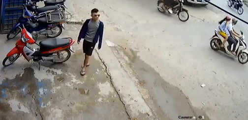 Chỉ sau vài giây, thanh niên đã nổ máy xe định tẩu thoát. Cùng lúc, một cô gái từ trong nhà lao ra truy đuổi khiến nam thanh niên hốt hoảng vứt xe vứt dép rồi nhảy lên xe đồng bọn đang chờ gần đó.