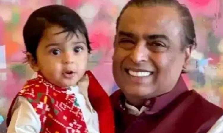 Tỷ phú giàu nhất châu Á Mukesh Ambani bế cháu trai Prithvi Akash Ambani. Ảnh: Instagram/@lokpatrika.