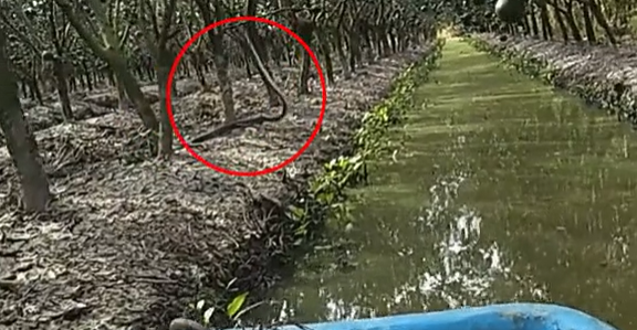 Chèo xuồng giữa vườn cây ở miền Tây, 1 thanh niên hoảng hồn khi thấy con rắn hổ mây ngóc đầu cao gần 1m
