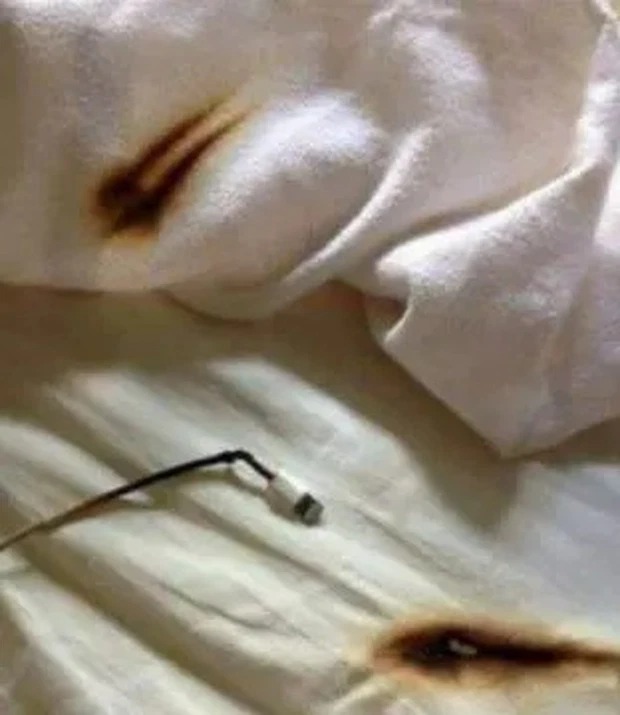 Những hình ảnh được chia sẻ trên trang Facebook CPR Kids cho thấy một chiếc sạc điện thoại đã bị chập điện và làm cháy đệm trải giường. Tai nạn này được đánh giá là có thể ảnh hưởng tới tính mạng do điện thoại rất nguy hiểm khi để cạnh các vật liệu dễ cháy.