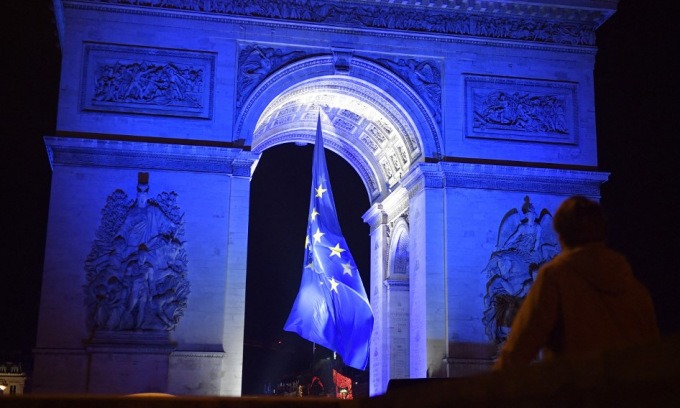 Cờ EU treo tại Khải Hoàn Môn ở thủ đô Paris hôm 1/1. Ảnh: AFP.