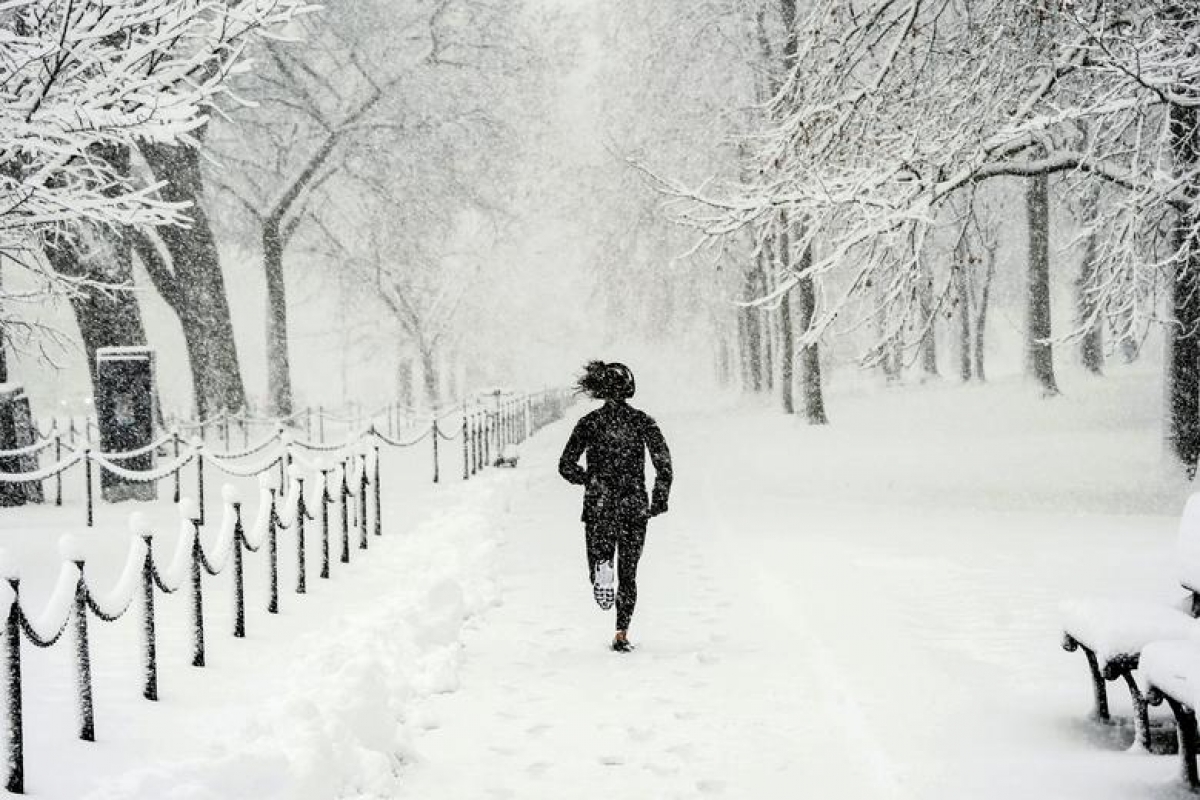 Theo Cơ quan Thời tiết quốc gia Mỹ, cơn bão tuyết đầu mùa với sức gió 64km/h đã gây ra lượng tuyết rơi dày từ 12-25 cm trong các khu vực bị ảnh hưởng. Cảnh báo thời tiết nguy hiểm được công bố từ bang Carolina đến New Jersey. Trong ảnh: Một người chạy bộ tại công viên National Mall trong cơn bão tuyết ở Washington ngày 3/1.