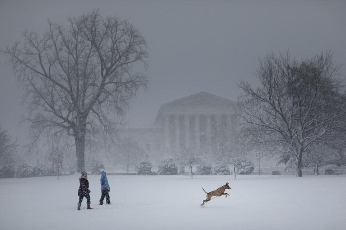 Cơ quan Thời tiết quốc gia Mỹ cho biết, tính đến 16h ngày 3/1 (giờ Mỹ), tuyết đã rơi dày 21,59cm ở thủ đô Washington, 22,86cm ở bang miền Đông Tennessee, 37cm ở bang Virginia và 39,37cm ở bang Maryland. Trong ảnh: Bão tuyết gần Tòa án Tối cao Mỹ.