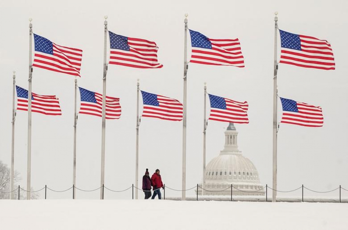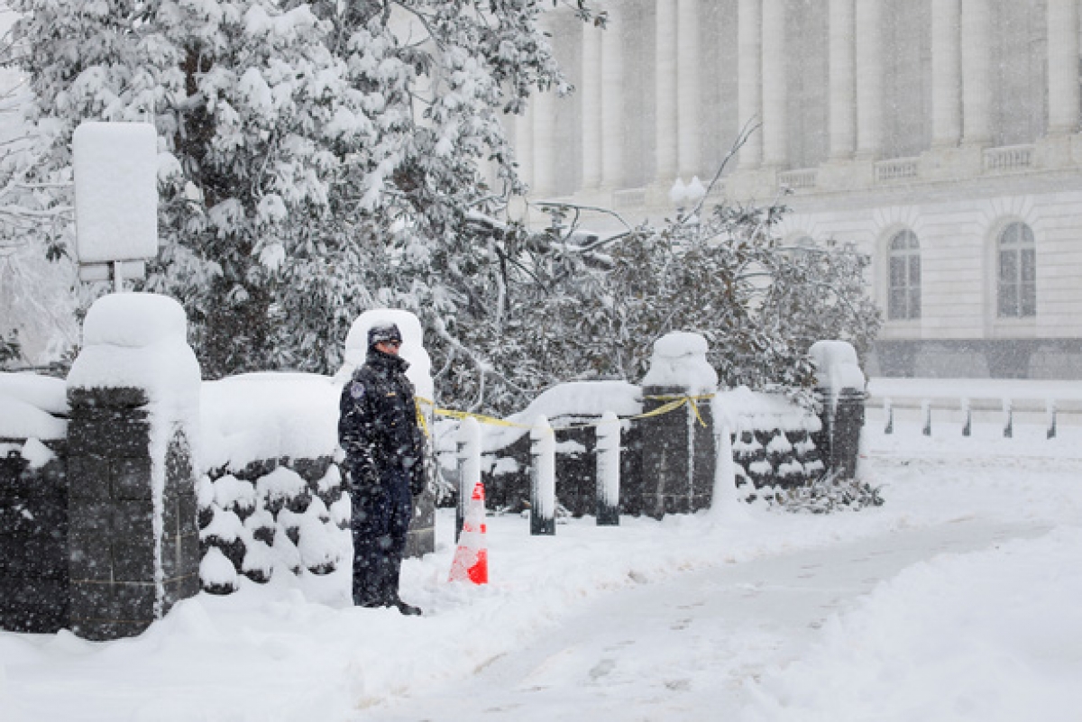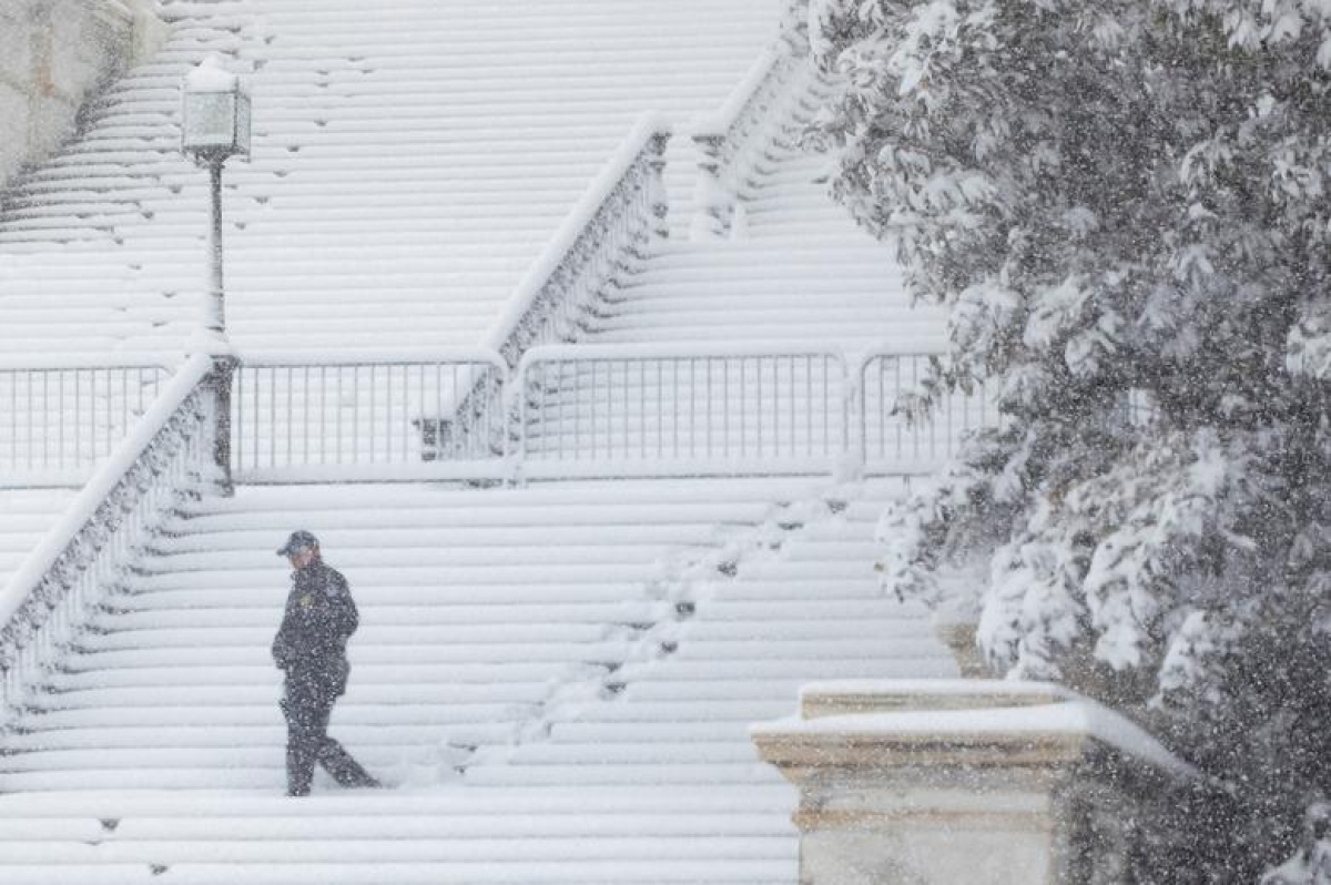 Tuyết phủ trắng xóa bên ngoài Tòa nhà Quốc hội Mỹ.