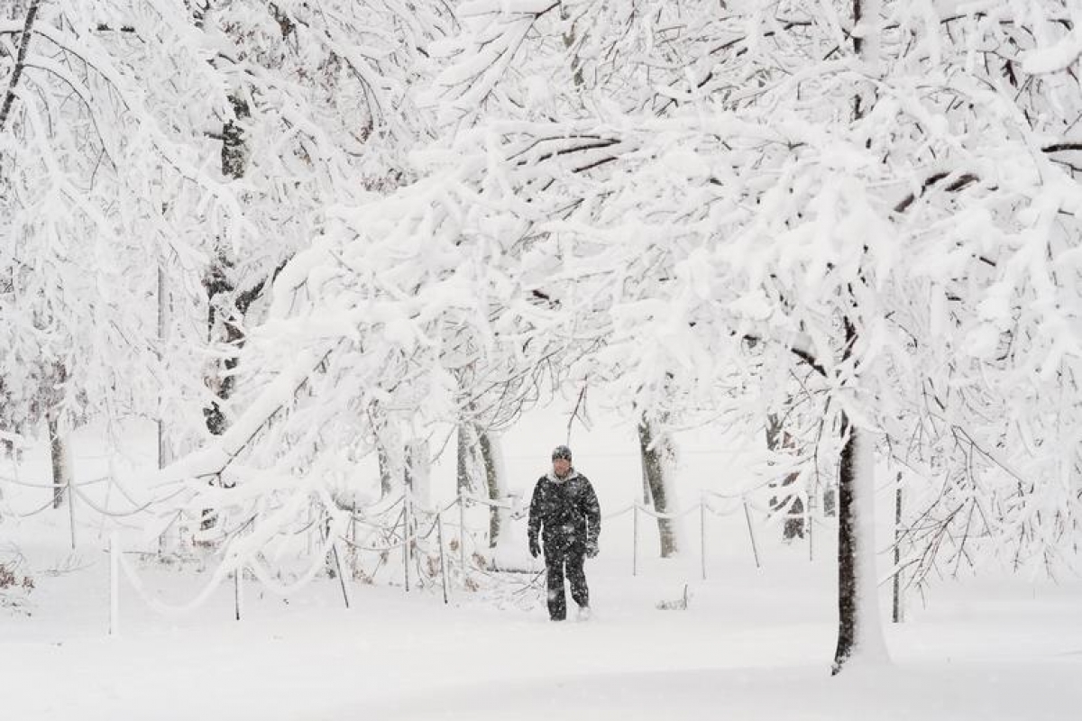 Một người đàn ông đi dưới những tán cây phủ đầy tuyết ở thủ đô Washington ngày 3/1.