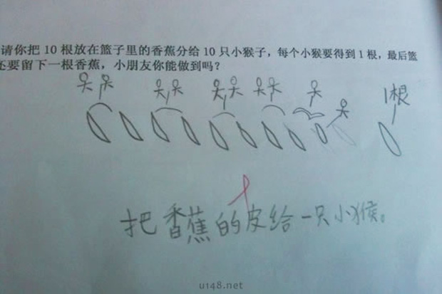 Câu hỏi cô giáo đưa ra cho học trò mình như sau: Tổng cộng có 10 quả chuối ở trong rổ. Chia 10 quả chuối cho 10 chú khỉ, mỗi chú khỉ đều được 1 quả. Làm cách nào để cuối cùng vẫn có một quả chuối ở trong rổ?
