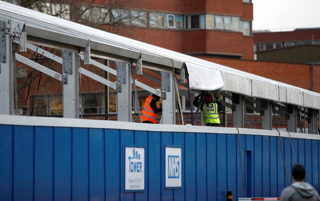 Các công nhân xây dựng một bệnh viện dã chiến trong khuôn viên Bệnh viện St. George ở phía nam London. Ảnh: Reuters.