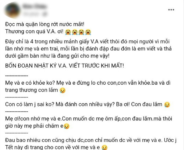 Mới đây, trên khắp mạng xã hội lan truyền nội dung những dòng nhật ký được cho là của V.A - nạn nhân bị dì ghẻ bạo hành dẫn tới tử vong ở Bình Thạnh (Tp.HCM) viết trước khi qua đời. Theo đó, đây chỉ là 4 trong số rất nhiều mảnh giấy của nạn nhân vì mỗi lần nhớ mẹ và em trai hay bị "dì ghẻ" Nguyễn Võ Quỳnh Trang hành hạ, V.A. đều sẽ viết và thả dưới gầm bàn như là một cách em gửi cho mẹ vậy.