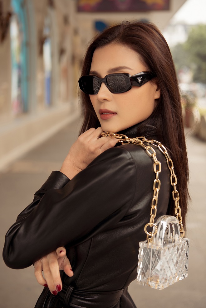 Ở set đồ khác, Thúy Diễm lựa chọn áo da khoác ngoài lựa chọn thiết kế váy da dáng dài quá đầu gối kết hợp thắt lưng tạo điểm nhấn ở vòng 2 nhỏ nhắn. Phối cùng set đồ, cô đi boots đùi cùng màu và chất liệu sang chảnh, thời thượng. Cùng với đó, nữ diễn viên đeo thiết kế kính mắt dáng chữ nhật phù hợp với gương mặt. Thúy Diễm cũng khéo léo kết hợp với túi Dior Book Tote Pink - một trong những mẫu túi đắt hàng nhất nhì của nhà mốt Pháp.