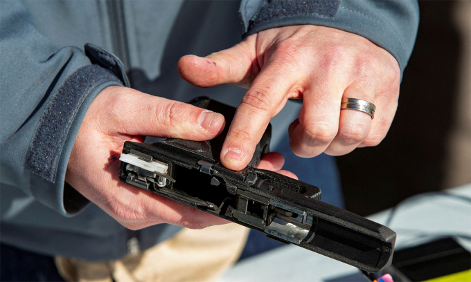 Kỹ thuật viên của SGW Designworks giới thiệu bộ phận bên trong súng thông minh tại sự kiện ở Boise, bang Idaho, Mỹ ngày 7/1. Ảnh: Reuters.