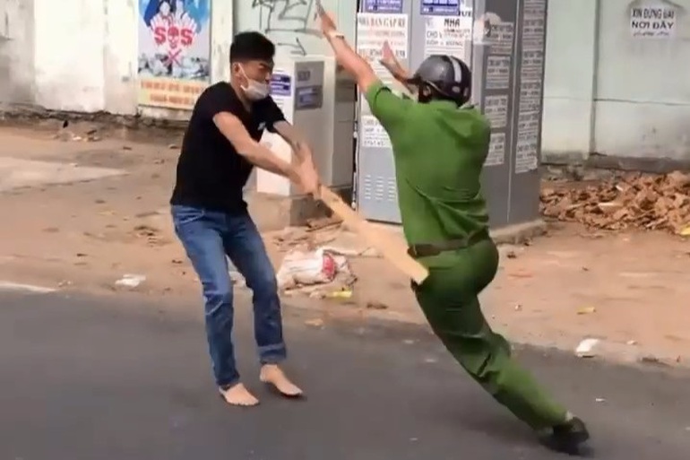 Hiếu dùng gậy đánh cán bộ công an (Ảnh cắt từ clip).