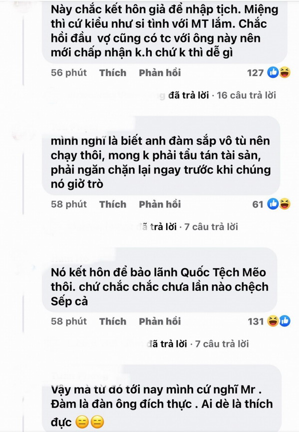 Ngay lập tức, thông tin này được dân tình truyền tay nhau một cách chóng mặt và đăng tải liên tục trên khắp các hội nhóm. Đáng chú ý, nói về cuộc hôn nhân của Mr Đàm, người hâm mộ đã để lại rất nhiều luồng ý kiến. Trong đó, hầu hết khán giả cho rằng việc giọng ca sinh năm 1971 kết hôn với bà Liên Phạm chỉ là kết hôn giả trên danh nghĩa để lấy quốc tịch Mỹ chứ không hề có quan hệ tình cảm: