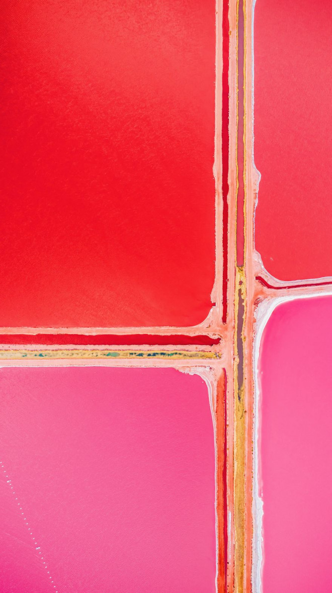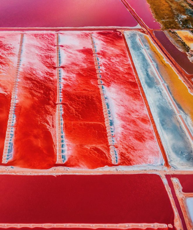 Muối hồng trên bờ hồ lấp lánh như tuyết và tất cả trông giống như những bức tranh trừu tượng. Trong trường hợp này, thiên nhiên và màu sắc đã làm nên điều kỳ diệu.