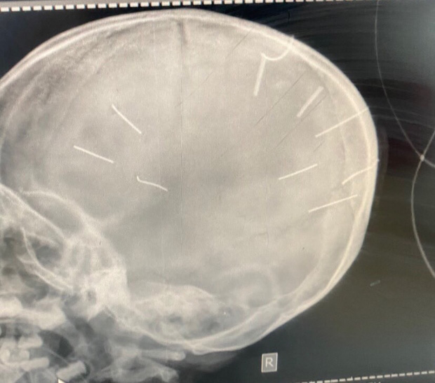Bệnh viện Đa khoa Xanh Pôn đã tiến hành chụp cắt lớp dựng hình, nhận thấy có những hình ảnh giống như đinh gỗ ở sọ và tổ chức não, tổng cộng 9 cái.