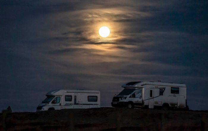Mặt Trăng lặn sau một chiếc xe tải đậu trong công viên quốc gia North York Moors ở Yorkshire. Ảnh: Danny Lawson / PA.