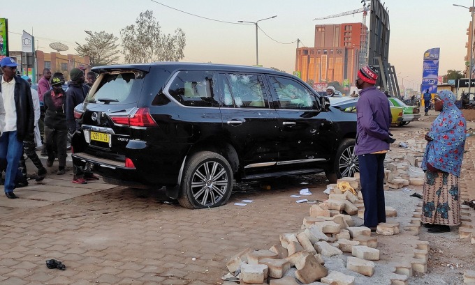 Ôtô đầy vết đạn gần dinh thự của Tổng thống Burkina Faso hôm 24/1. Ảnh: Reuters.