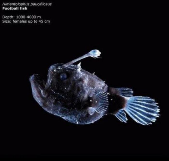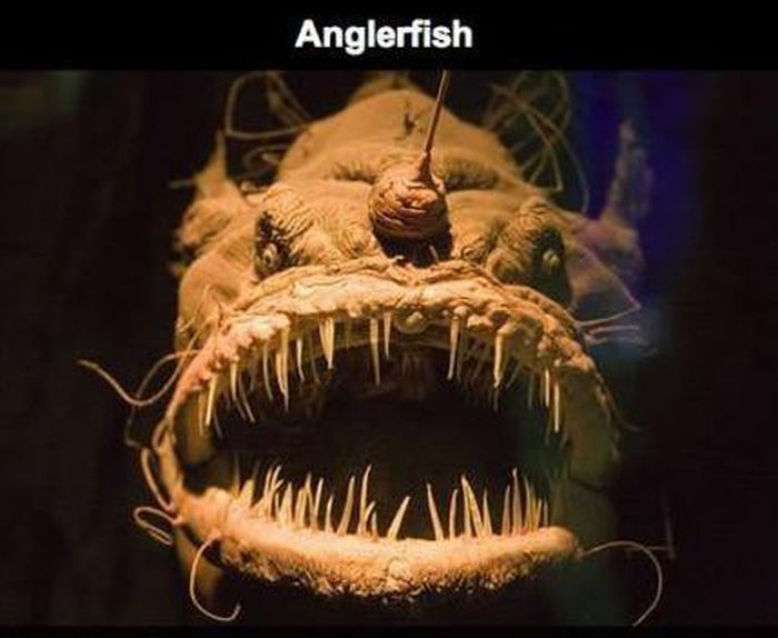 Anglerfish - hay còn gọi là "cá cần câu" sống dưới đáy biển sâu được xem là quái vật biển xấu xí nhất trên trái đất. Nó có cái đầu to bự, chiếc “cần” phát ra ánh sáng giống như ánh đèn pha trên đầu với khuôn miệng lớn hình lưỡi liềm đầy răng.