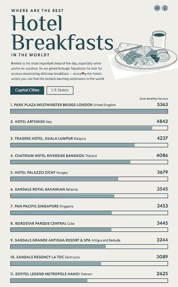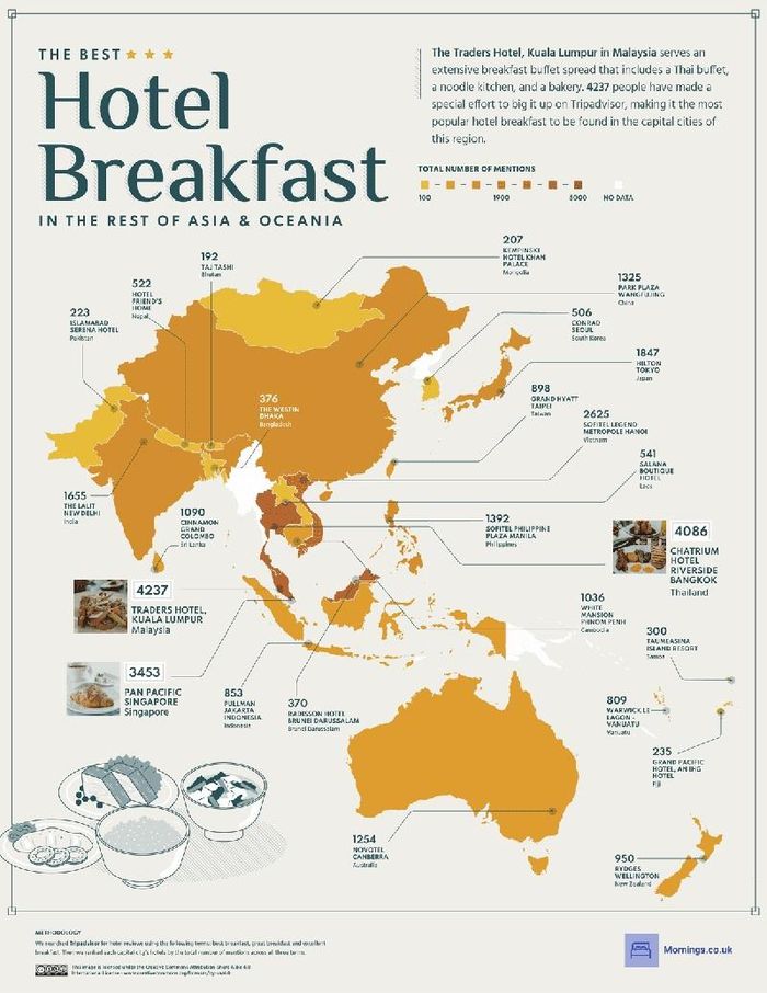 Khảo sát được dựa trên những lượt đề cập về “bữa sáng ngon nhất”, “bữa sáng tuyệt vời” và “bữa sáng tuyệt hảo” cho mọi khách sạn ở mọi thành phố thủ đô toàn thế giới và mọi bang của Mỹ trên Tripadvisor. Sau đó, Morning.co.uk đă lập bản đồ những khách sạn có bữa sáng tốt nhất. “Khi có tới 5.000 người giới thiệu một bữa sáng ở khách sạn, th́ chuyến đi có lẽ xứng đáng”, Mornings.co.uk nhận định.