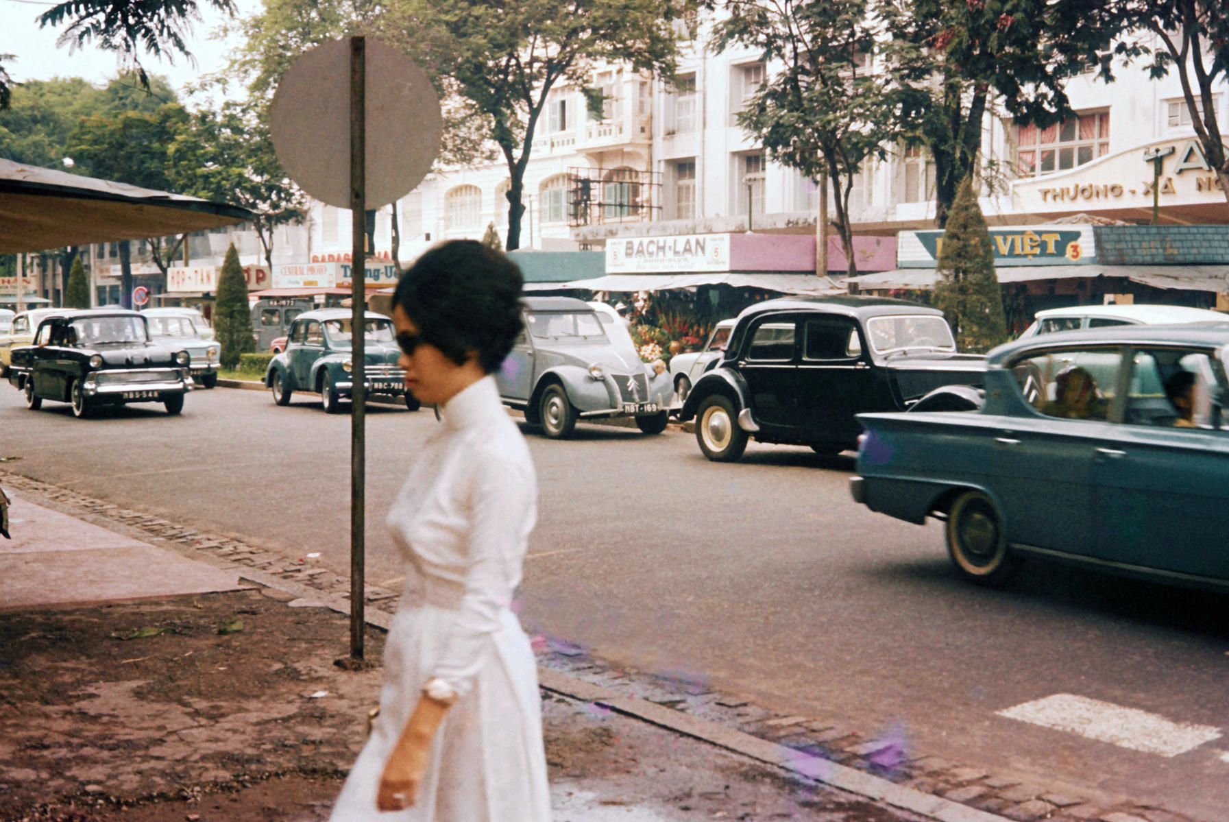 Cô gái với áo dài trắng láy xe trên đường phố Sài Gòn năm 1973