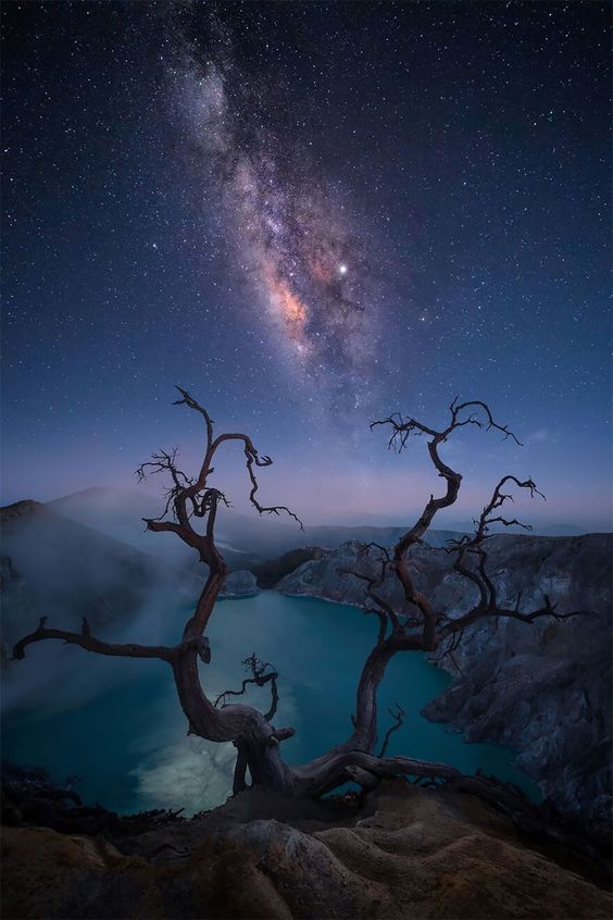 Ngước nhìn bầu trời đêm cùng dải ngân hà sáng lấp lánh phía trên đỉnh núi lửa Ijen. Nguồn: Pinterest