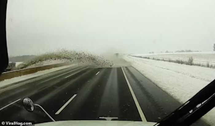Bóng dáng chiếc máy cày thấp thoáng ở phía đối diện trên con đường cao tốc trơn trượt đạt vận tốc hơn 110 km/h đã tạo ra lực bắn khủng khiến những mảnh băng văng sang bên này làn đường.