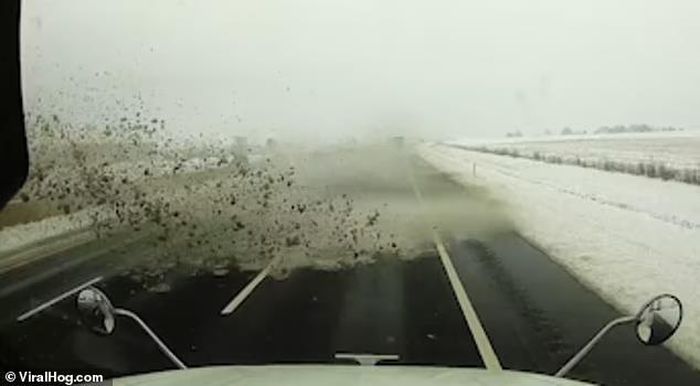 Đoạn video được lan truyền ghi lại cảnh tượng một chiếc máy cày tuyết phun xối xả một lượng lớn băng tuyết vào xe cộ đang chạy ở làn ngược chiều trên đường cao tốc. Trông chúng giống như "vòi rồng" và sự thật sức tàn phá cũng chẳng kém gì "vòi rồng" khi đã gây ra một vụ tai nạn liên hoàn.