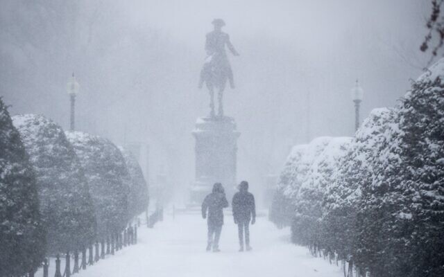 Hai người đi bộ về phía bức tượng George Washington trong Vườn Công cộng Boston trong bão tuyết ngày 29/1.