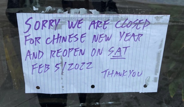 Chỉ là hôm nay qua ăn, trên map vẫn đề mở cửa nhưng tới nơi th́ đóng. Ok quay về thôi. Ra đến xe thấy có ǵ là lạ ngờ ngợ liền quay lại đọc kỹ cái bảng “chinese new year”.
