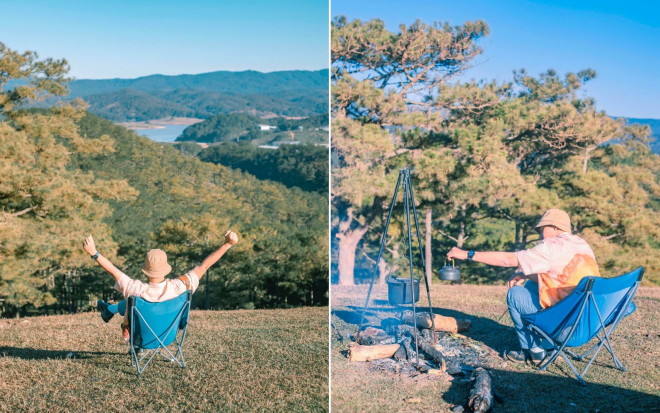 Khoảng 17h15 là lúc đẹp nhất để bạn chụp hình với hoàng hôn, thời điểm này chụp ảnh trên đồi bao đẹp. Tour được phục vụ sẵn ghế nên bạn có thể mang ghế ra ngồi chụp ảnh rất chill như Rọt. Giữa rừng thông mênh mông đất trời, vô số góc chụp ảnh cho bạn tha hồ sống ảo và cả sống thật.