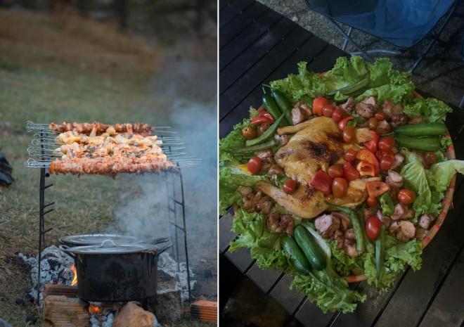 Buổi chiều, tour có chuẩn bị tiệc BBQ cho du khách. Chàng trai blogger nhắn nhủ du khách đừng sợ ít thức ăn, vì thực tế anh chàng đã dùng bữa xong là đứng lên, đi không nổi. Một phần ăn sẽ bao gồm gà nướng, thịt nướng, xúc xích, rau củ quả, cơm lam, cháo... và thêm cả rượu cần. Chất lượng đồ ăn rất tốt, ăn ngon miệng, một phần mà 4 đến 5 người ăn vẫn còn dư thừa.