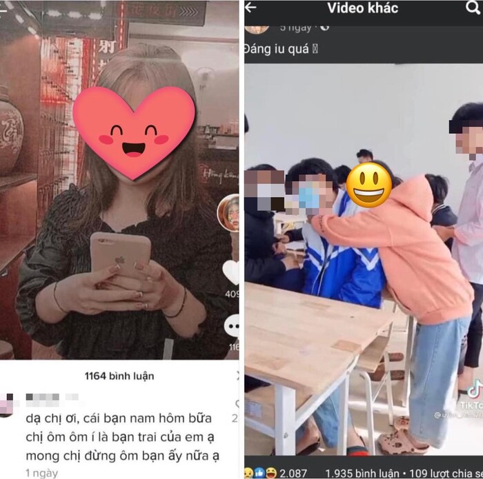 T.L (người tự xưng là bạn gái của chính chủ) cho biết: "Dạ chị ơi, cái bạn nam hôm bữa chị ôm ôm í là bạn trai của em ạ. Mong chị đừng ôm bạn ấy nữa ạ".