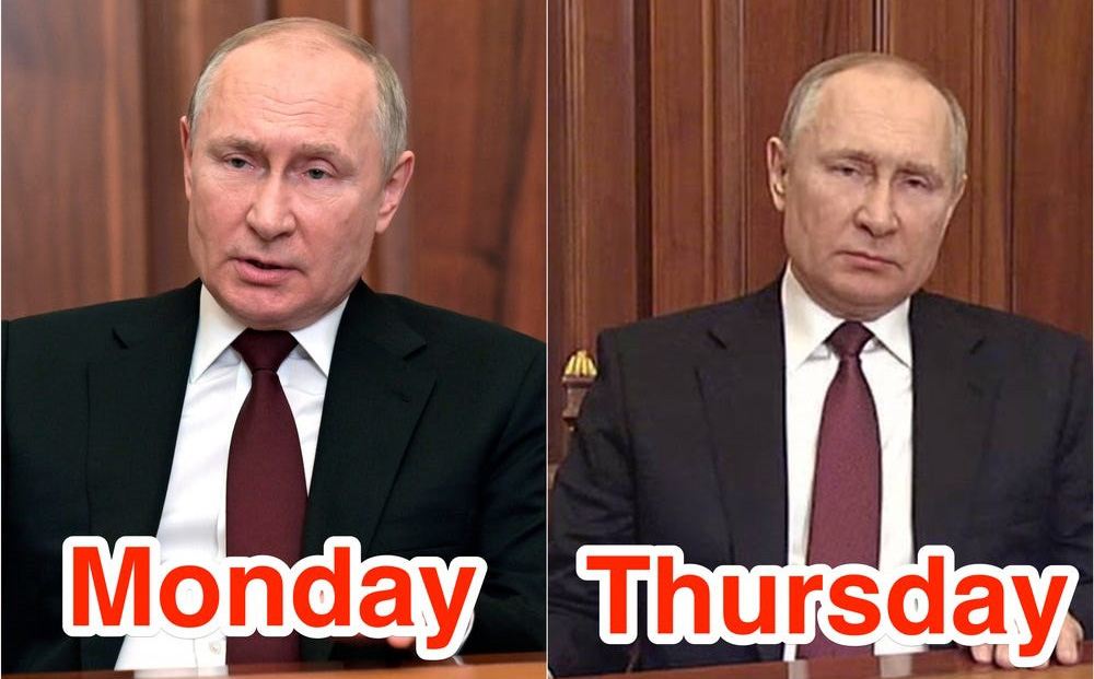 Cả hai đoạn video đều được quay cảnh ông Putin dường như ngồi ở cùng một vị trí, cùng một chiếc bàn, mặc trang phục giống nhau: Áo vest đen với áo sơ mi trắng và cà vạt màu hạt dẻ.