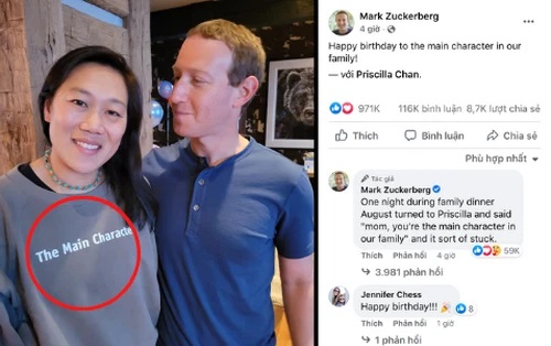 Để minh chứng cho vai trò "trụ cột chính" có tiếng nói nhất trong gia đình, trong ảnh, Priscilla Chan cũng mặc một chiếc áo hoodie có in dòng chữ "the main charater" (Nhân vật chính) cực kỳ đồng bộ. Cô nhìn thẳng máy ảnh cười tươi còn anh chồng đứng bên thì nhìn vợ với ánh mắt âu yếm. Khoảnh khắc tình bể bình của cặp vợ chồng Mỹ khiến nhiều người phải ghen tị.