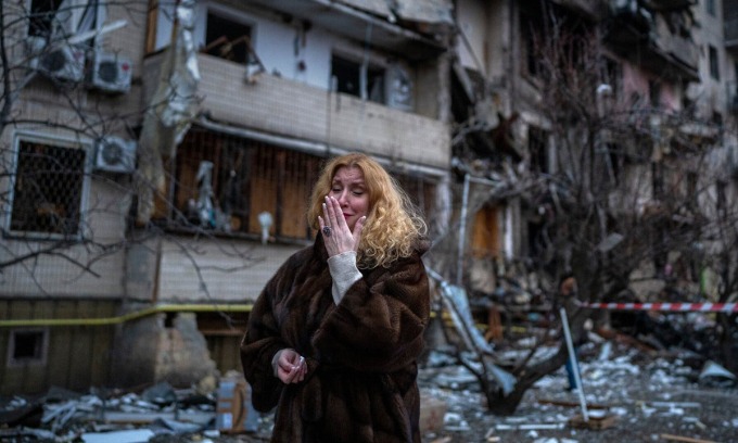 Người phụ nữ bật khóc sau cuộc tấn công rocket vào thủ đo Kiev ngày 25/2. Ảnh: AP.