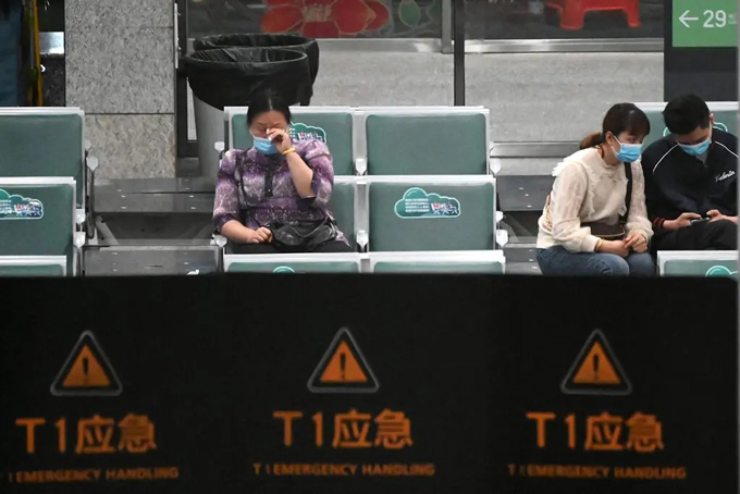 Thân nhân của các hành khách trên chuyến bay ngồi tại khu vực chờ của Sân bay Quốc tế Bạch Vân, Quảng Châu hôm 21/3. Ảnh: AFP