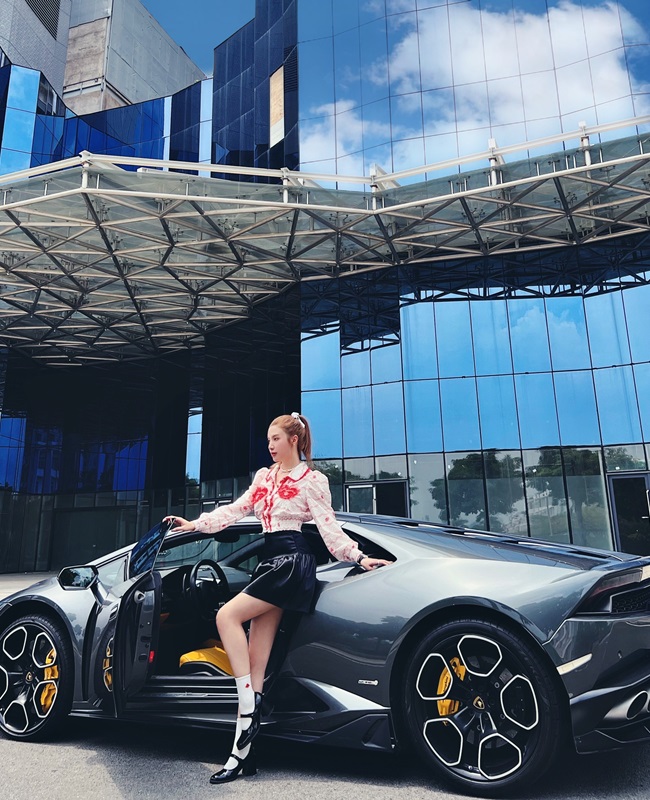 Nữ chủ nhân xinh đẹp trong trang phục đậm nét tiểu thư thơ ngây, pha chút thời trang năng động. Điểm nhấn là phụ kiện đồng hồ, điện thoại bạc tỷ cho thấy đời sống cao cấp, sang chảnh của ngôi sao U30. Fan tinh ý chắc hẳn đã nhận ra bạn đồng hành của Hạnh Sino là chiếc Lamborghini Huracan, cô tự mua thưởng bản thân vào dịp 8/3 mới đây.