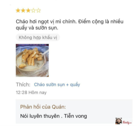 Ngôn ngữ của vị khách này khá lịch sự, có tính xây dựng: "Cháo hơi ngọt vị mì chính. Điểm cộng là nhiều quẩy và sườn sụn".