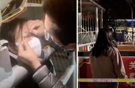 Một cô gái người Trung Quốc. Phải trải qua phẫu thuật mắt hai mí đã phải cắt chỉ ở cổng khu dân cư phức hợp nơi cô sinh sống. Sau khi khu vực này bị phong tỏa vì Covid-19.