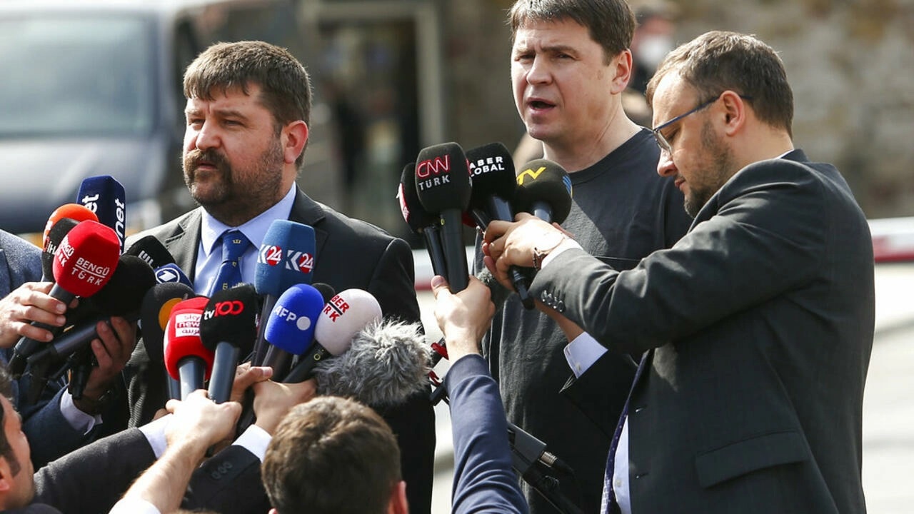 Ông Mykhailo Podolyak (G), cố vấn tổng thống Ukraina, tham gia đoàn đàm phán với Nga trả lời báo chí sau phiên họp, ngày 29/03/2022, Istanbul, Thổ Nhĩ Kỳ. AP - Emrah Gurel