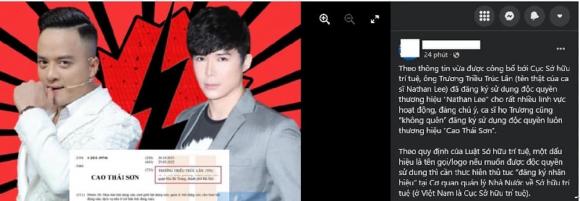 Tối 30/3, trên một số diễn đàn lớn xuất hiện thông tin nam ca sĩ Nathan Lee đã đăng kí độc quyền thương hiệu "Cao Thái Sơn": "Theo thông tin vừa được công bố bởi Cục Sở hữu trí tuệ, ông Trương Triều Trúc Lân (tên thật của ca sĩ Nathan Lee) đã đăng ký sử dụng độc quyền thương hiệu "Nathan Lee" cho rất nhiều lĩnh vực hoạt động, đáng chú ý, ca sĩ họ Trương cũng "không quên" đăng ký sử dụng độc quyền luôn thương hiệu "Cao Thái Sơn".