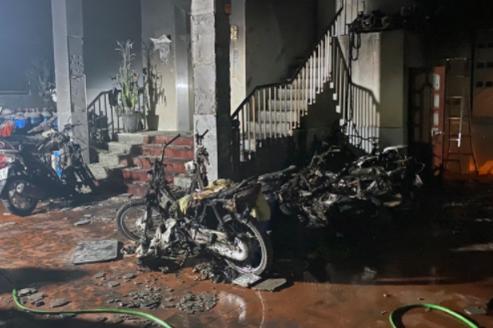 Sau khoảng 3-4 lần châm lửa, đám cháy bùng lên từ một chiếc xe máy rồi lan ra nhiều chiếc bên cạnh. Nghi phạm cũng bỏ chạy khỏi hiện trường.