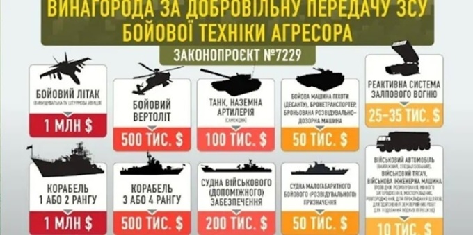 Ukraine mới đây thông qua đạo luật thưởng tối đa một triệu USD cho những quân nhân Nga đầu hàng và giao nộp các khí tài như máy bay, chiến hạm. Trong một thông báo được đăng trên trang web của quốc hội Ukraine, Đạo luật 7229 đề xuất rằng bất kỳ ai giao thiết bị của Nga cho nước này sẽ nhận được các khoản tiền thưởng hậu hĩnh.